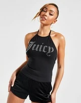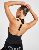 Hol dir das Neckholder-Top mit Diamanten von Juicy Couture im Stil der 90er Jahre auf. Dieses schmal geschnittene Top in schwarzer Farbgebung besteht aus glattem und dehnbarem Polyestergewebe. Es verfügt über einen Rundhalsausschnitt mit Neckholder-Trägern zum Binden. Abgerundet mit Juicy Coutures charakteristischem Juicy-Logo aus Strass auf der Brust. Waschmaschinenfest. Unser Model ist 172cm groß und trägt eine Größe S.